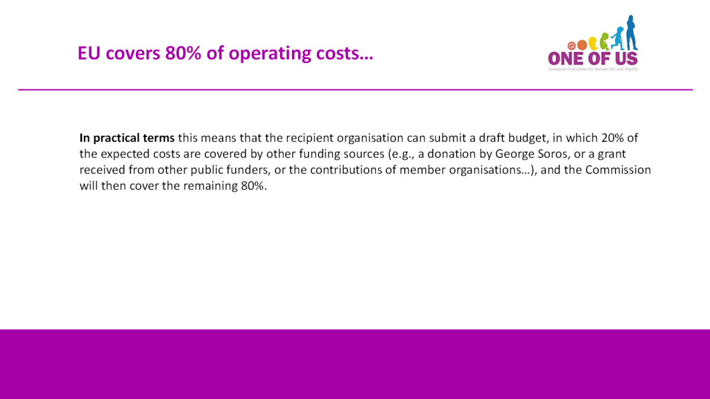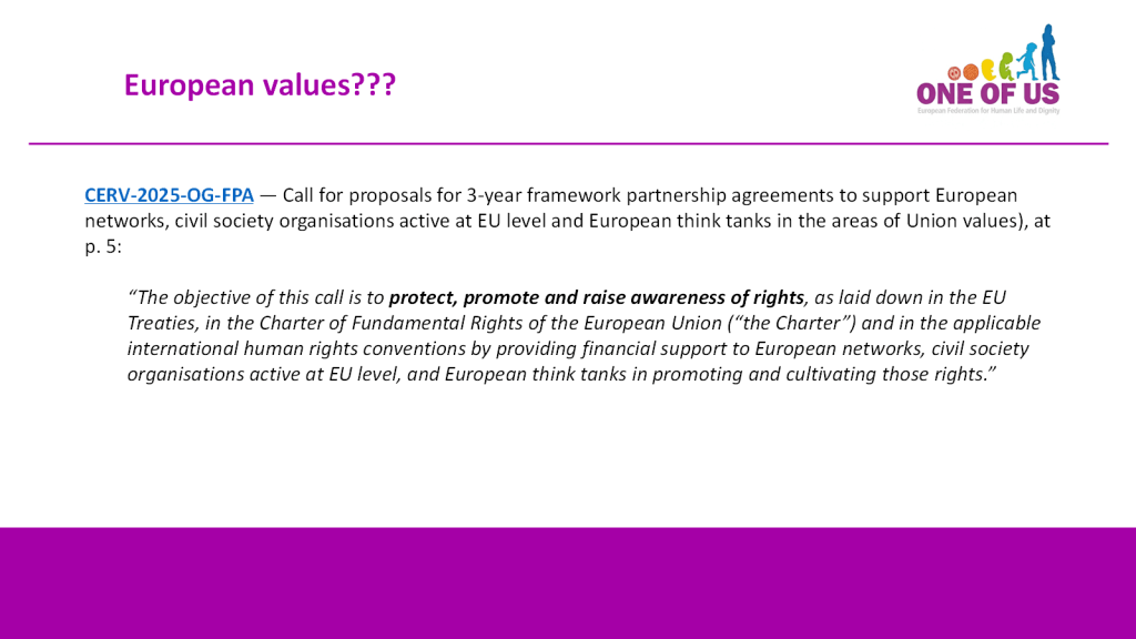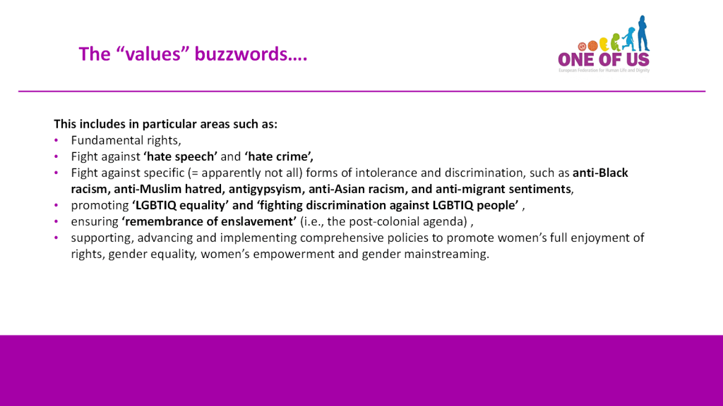 In this way, the Commission is systematically and deliberately creating an uneven playing field, in which those not agreeing to the Commission’s understanding of “our common values” (e.g., abortion, euthanasia, re-definition of marriage and family, etc.) must fight uphill battles.