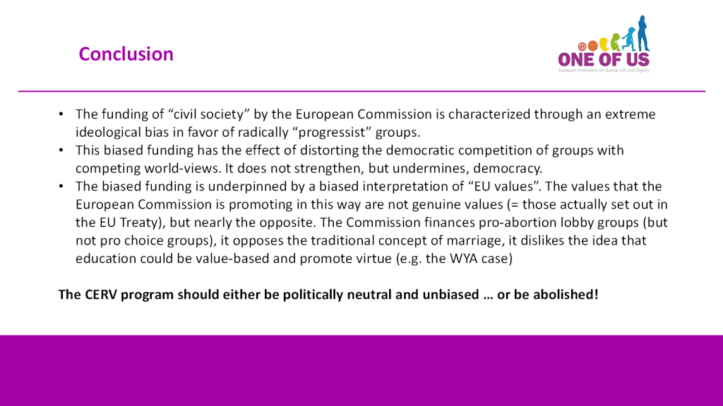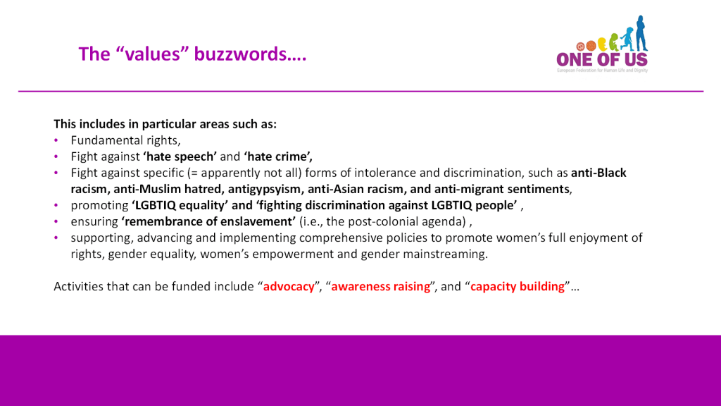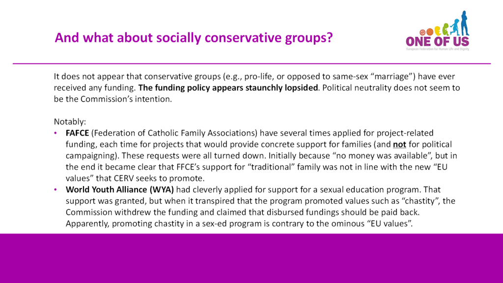 In this way, the Commission is systematically and deliberately creating an uneven playing field, in which those not agreeing to the Commission’s understanding of “our common values” (e.g., abortion, euthanasia, re-definition of marriage and family, etc.) must fight uphill battles.