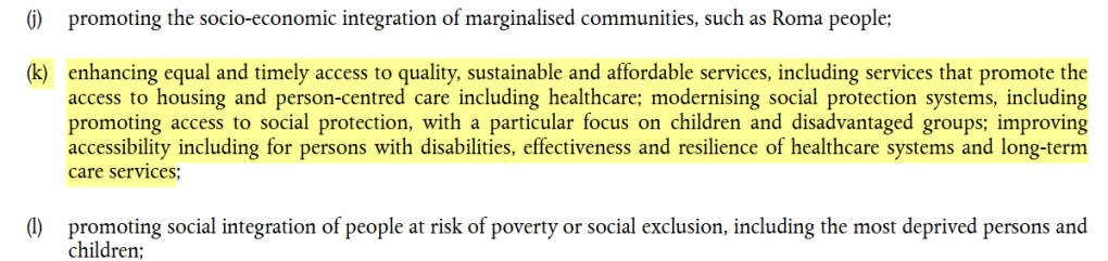In other words, “healthcare” is not even a “Specific Objective” of the ESF+ in its own right, but it is just a sub-item of a sub-item – in a list of 13 items, rather far down towards the end.